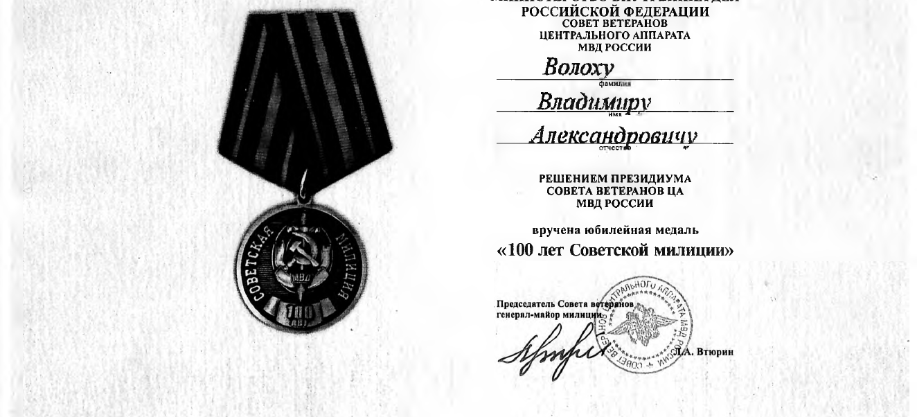 Решением Президиума Совета ветеранов Центрального аппарата МВД России большая группа ветеранов награждена Медалью «100 лет Советской милиции», среди которых первый заместитель Директора ?нститута миграции и межнациональных отношений профессор В.А. Волох. Награды вручил председатель Совета ветеранов ГУВМ МВД России генерал-майор милиции Ю.?. Шарогоров.